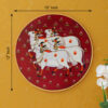 Crafted on a red plate, this pichwai portrays an enchanted encounter between a playful cow and a delicate lotus flower.